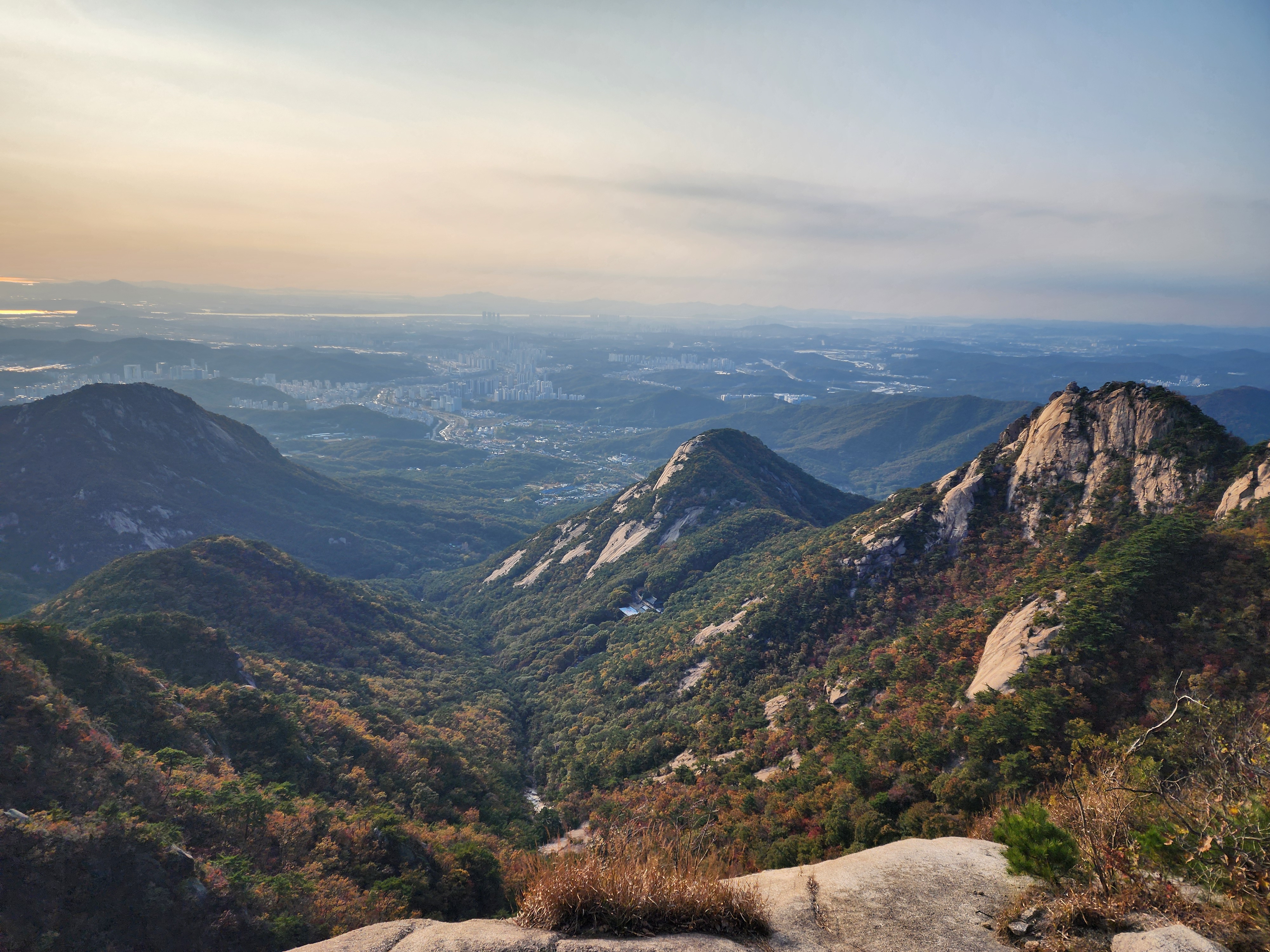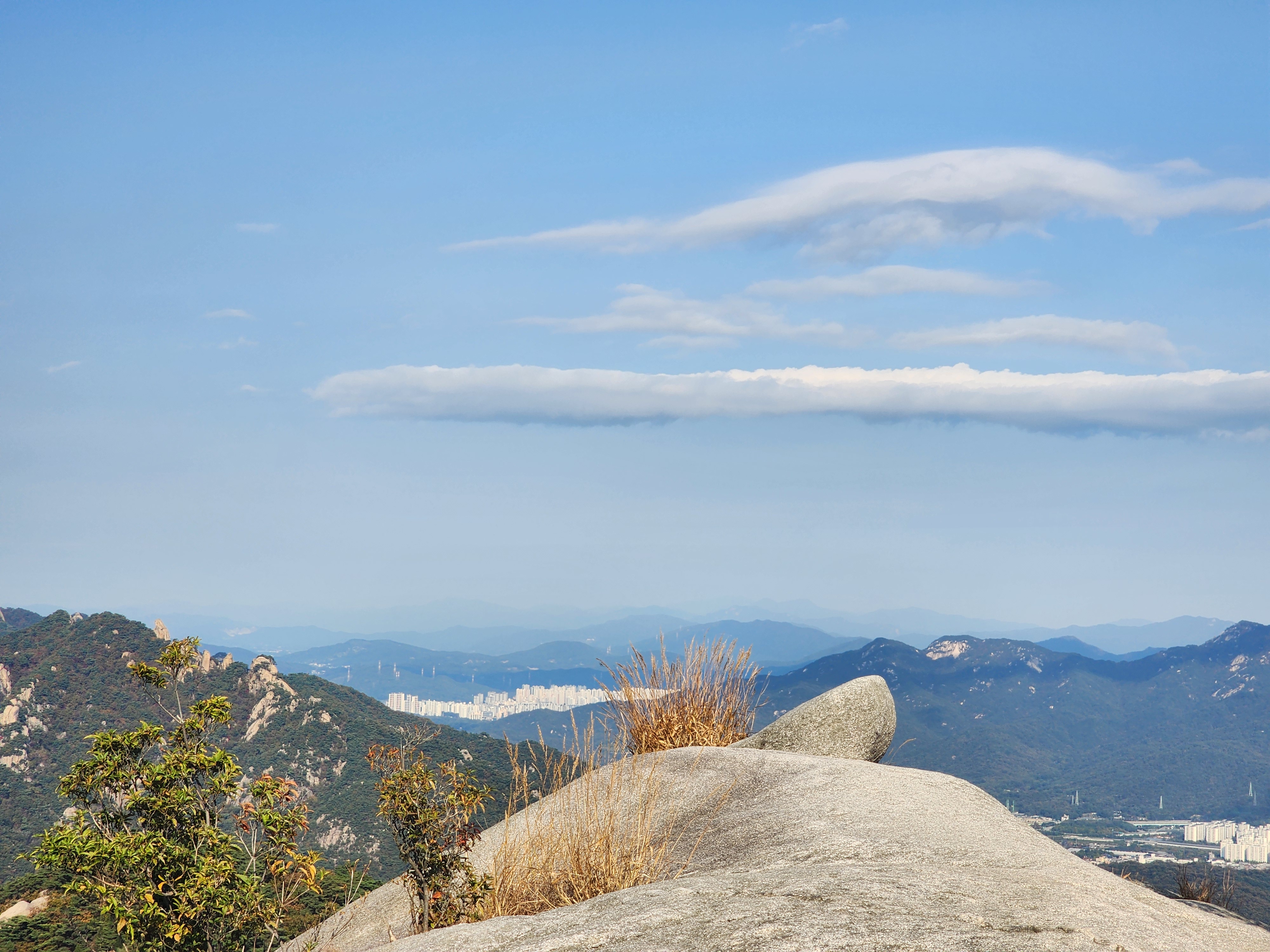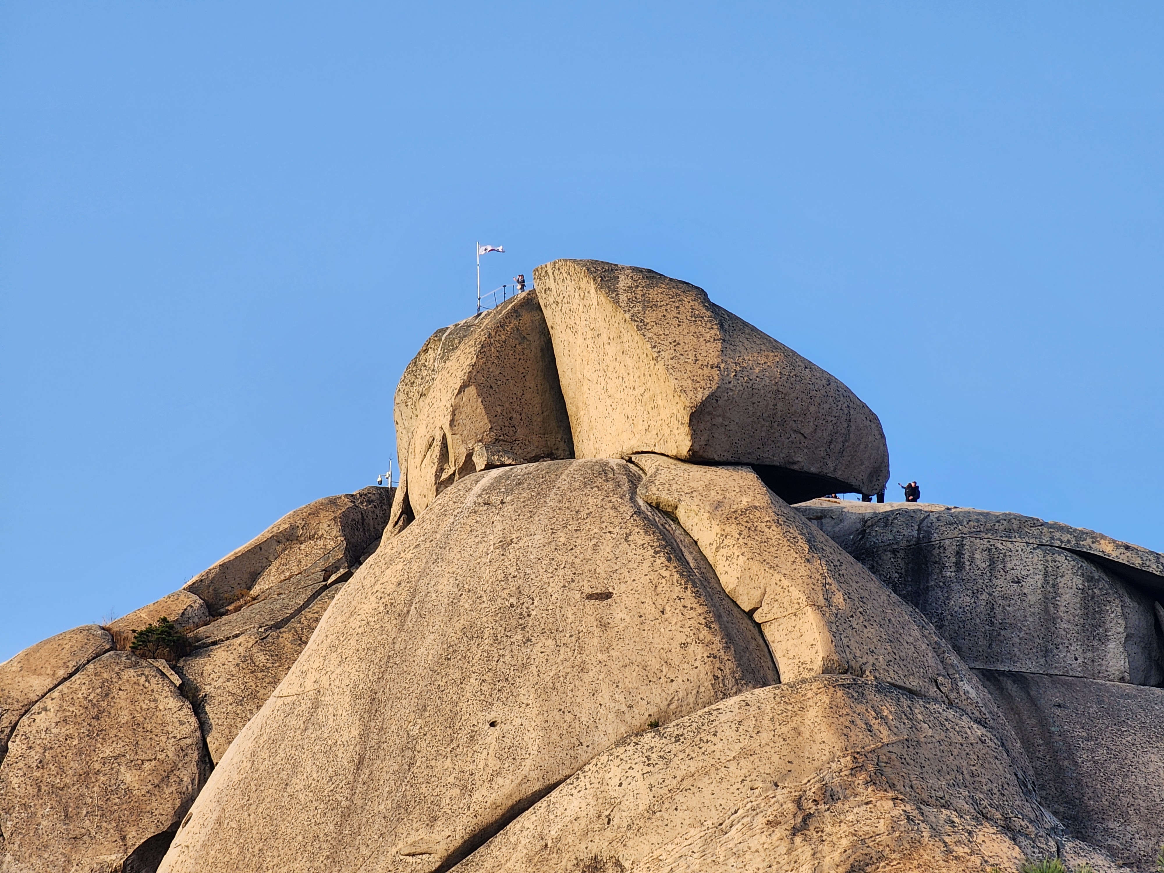 멀게 보였던 백운대와 인수봉이 점점 가까워지고 있다. 1시간 30분 만에 도착한 영봉 남쪽으로 인수봉이 우뚝 서 있는데 역광이라 풍광은 아쉽다. 그래도 영봉 일대에서 전체적인 북한산 조망은 아주 좋다. 동쪽으로 우이동 골짜기가 내려앉고, 서쪽으로 사기막 골짜기가 내려앉는다. 산 봉우리가 능선을 거쳐 계곡으로 부드럽게 내려앉는 모습을 보면 마음이 편안해진다. 높은 봉우리가 내려앉는 것과 나의 욕심을 내려놓는 것, 일맥상통하는 느낌이다.